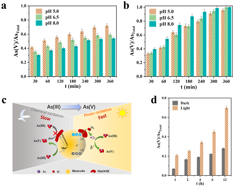 图1 黑暗(a)和光照(b)条件下水钠锰矿对As(III)的氧化作用;As(III)在水钠锰矿表界面转化过程示意图(c);天然水钠锰矿矿石对As(III)的氧化作用(d)