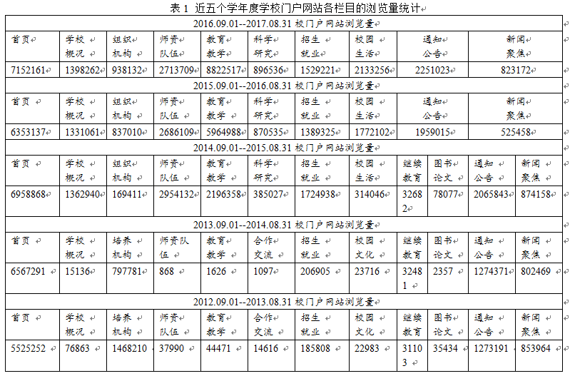 学校主页公开信息包括学校概况、组织机构、师资队伍、教育教学、科学研究、招生就业、校园生活、 通知公告、新闻聚焦、科苑学子、教学研究、校园活动、快速通道、光影凯发k8等栏目。2016-2017学年,学校门户网站访问量比上一年度增加496.9万人次,增长20.98%(表1)。新闻聚焦、教育教学、校园生活、通知公告、首页、组织机构、招生就业等栏目访问量均比去年有大幅度提升,其中新闻聚焦栏目访问量增长56.66%,教育教学栏目访问量增长47.91%。